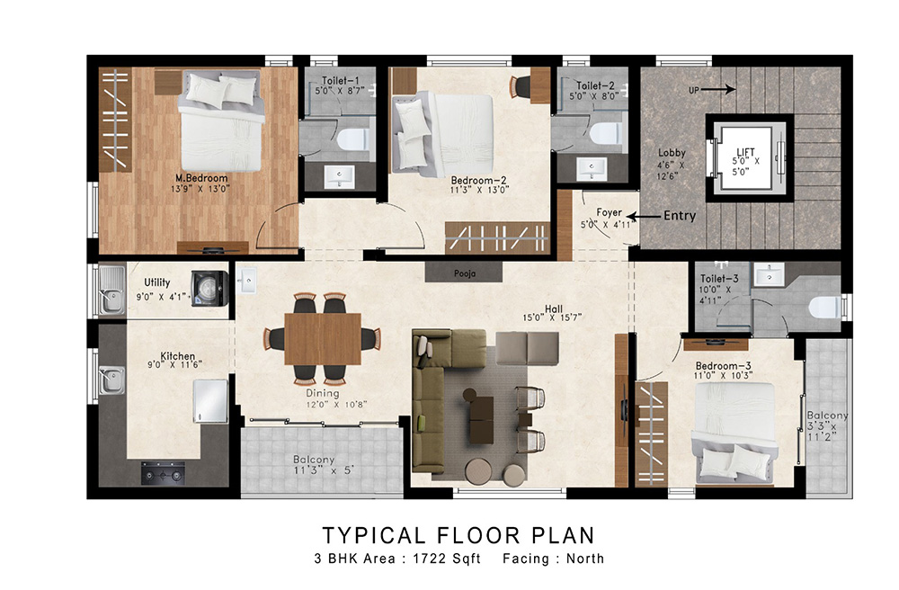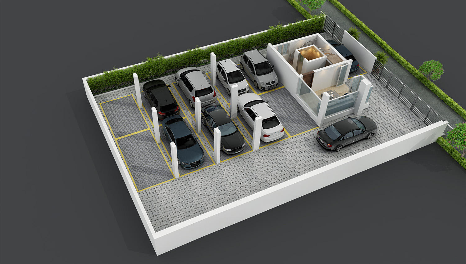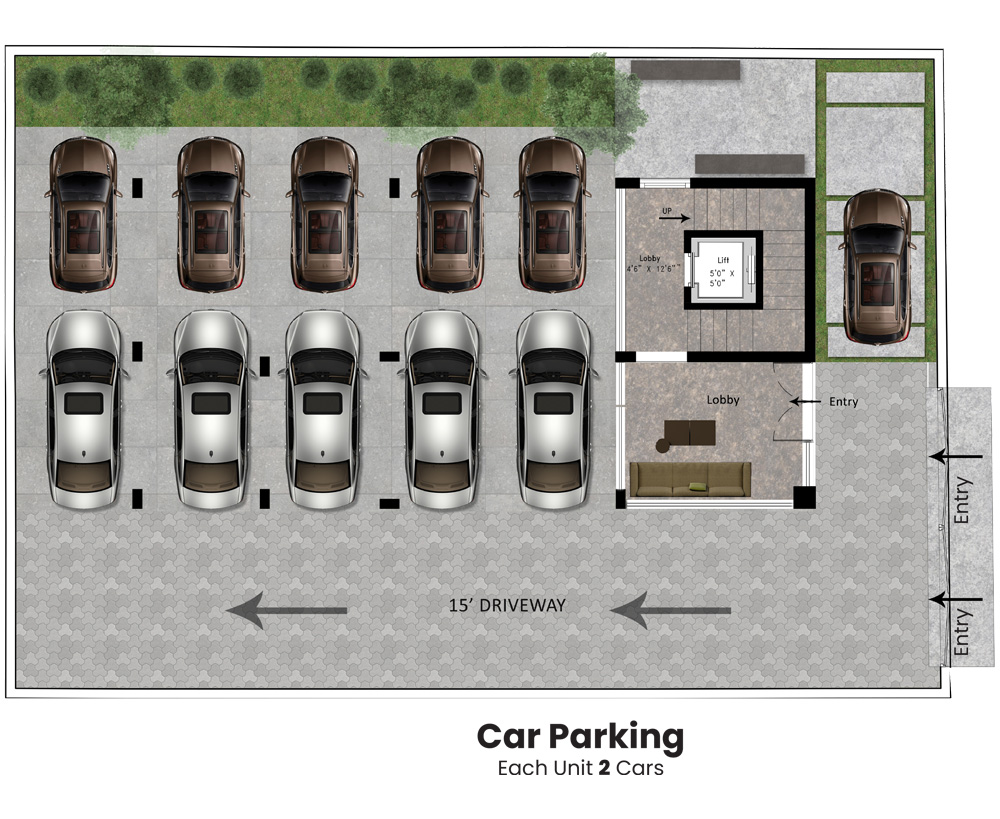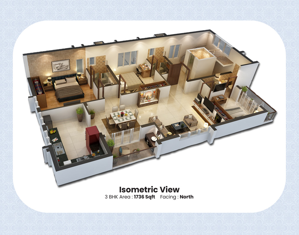 Rajali Paradise is elegantly designed in a triangular shape with clean lines and smooth edges. The apartments are neatly placed in the periphery of the triangle to give each of them the best views possible of the beautiful surroundings. The corner of the building is sculpted with a series of overhanging balconies reminiscent of early-modern high rises.